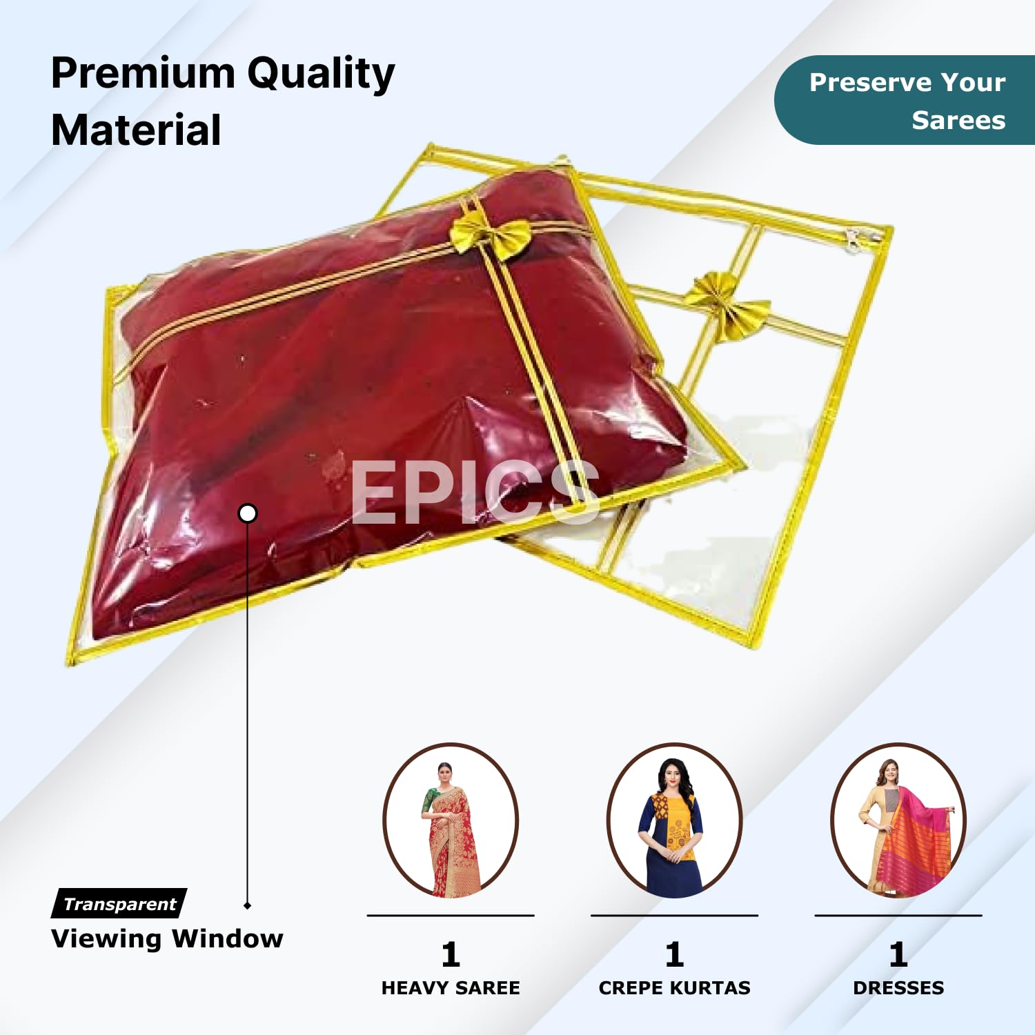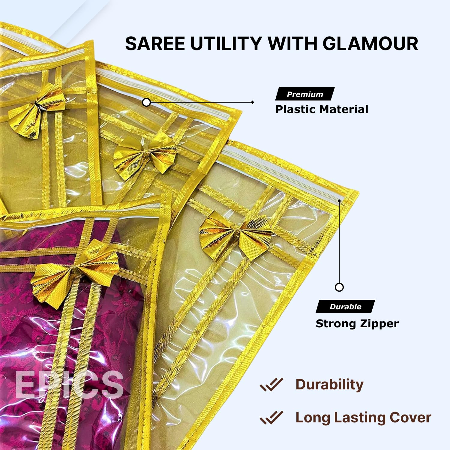 Crafted from high-quality transparent PVC plastic, our saree packing covers shield your garments from dust, moisture, and accidental damage. The clear design allows you to easily identify your saree without the need to open the cover, saving you time and hassle. The sturdy zip secures the saree in place, preventing creases and offering added protection during storage or travel. Every detail, including the golden ribbons, has been thoughtfully designed to add a touch of sophistication to your wardrobe organization.